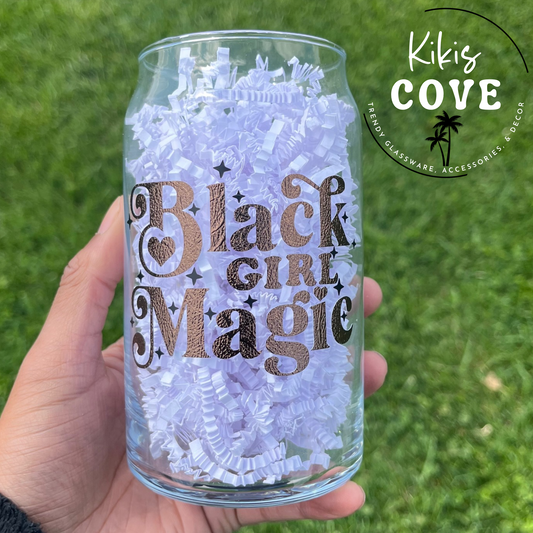 Black Girl Magic Glass Can – 16 oz with Bamboo Lid & Cheetah Straw