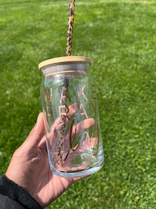 'Wake Pray Slay' Rose Gold Glass Can – 16 oz with Bamboo Lid & Cheetah Straw